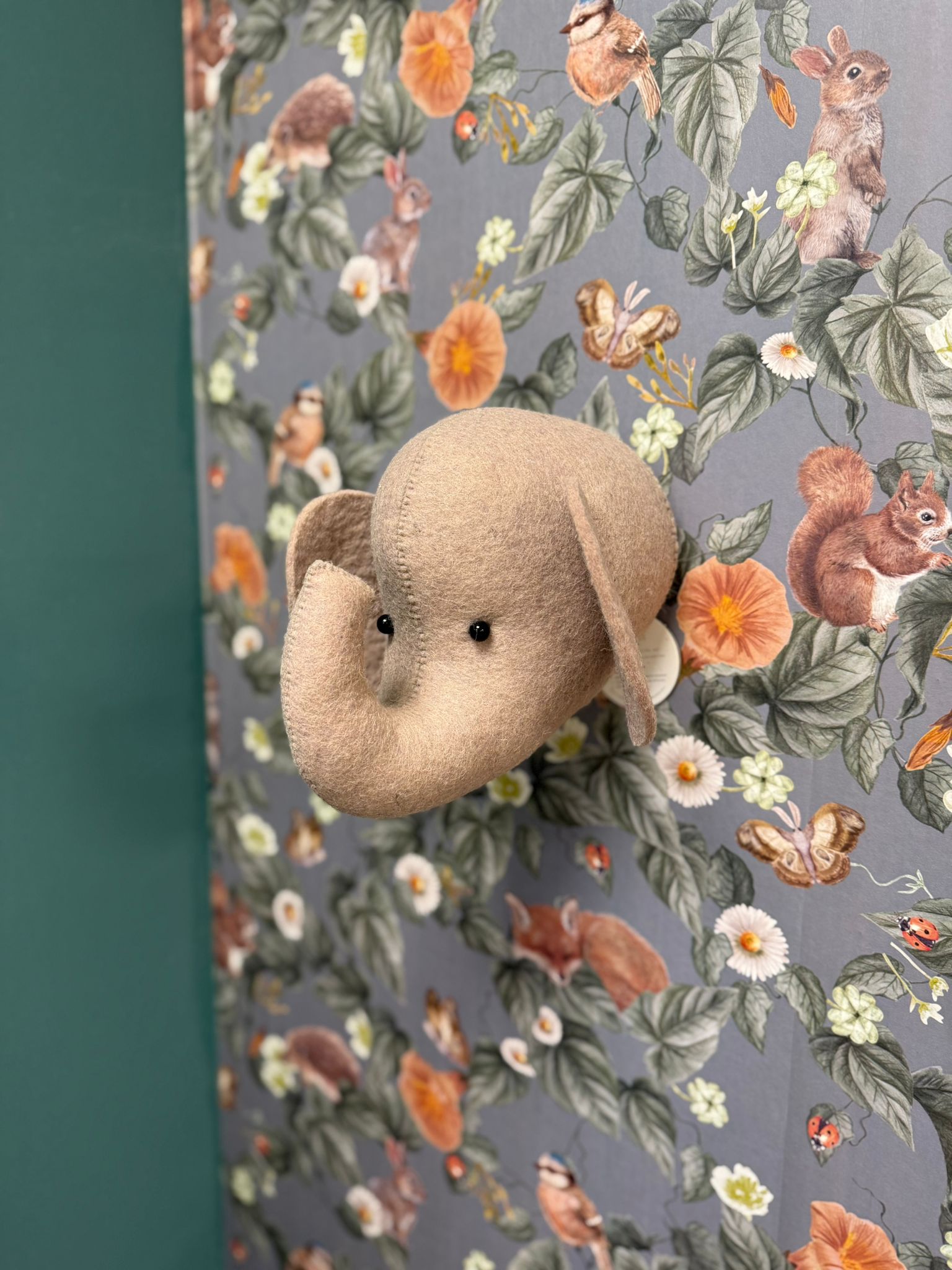 - Миниатюрная настенная голова слона из фетра с дружелюбным поднятым хоботом